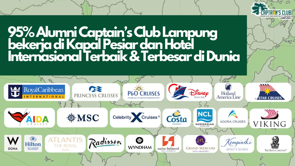 Dengan pengalaman dan kurikulum berstandar internasional, Captain’s Club Lampung membantu anak-anak muda di seluruh Provinsi yang ada di Indonesia untuk dapat berkarir di kapal pesiar dan hotel berbintang di Luar Negeri.